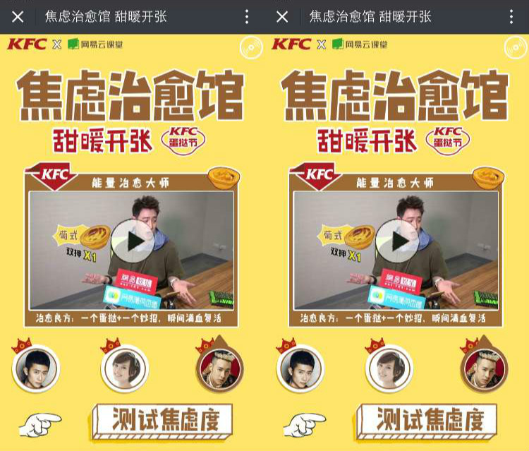 有调查发现近60%的年轻职场人面临着“周一恐惧”“工作拖延”“创意枯竭”“明言明语式老板“等问题,一连串的职场难题让年轻人陷入深深焦虑中,但是又找不到解决的办法。网易云课堂和肯德基刚好抓住这个共同痛点,联合打造了“焦虑治愈馆“。