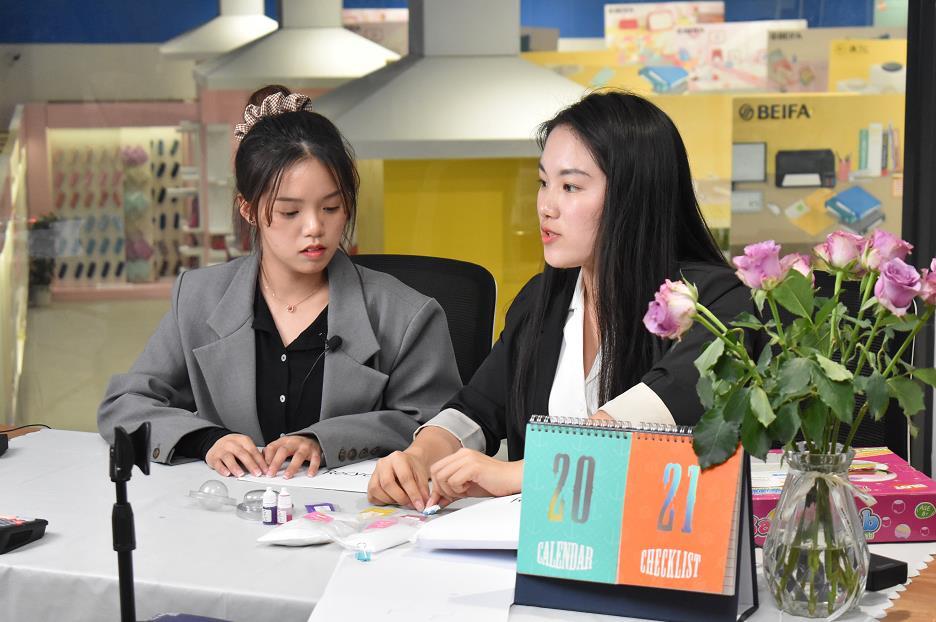 “Hi everyone,welcome to my live show.(大家好,欢迎来到我的直播间)”,日前,宁波职业技术学院国际学院2019级商务英语专业陈思思等八位同学走进了贝发公司的“云广交会”直播间,用一口流利的英语通过“云广交会”直播平台,向全球推介公司的四个系列近200种外贸文具办公用品。
