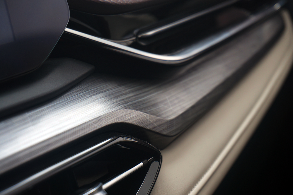 运用大尺寸触摸中控屏和语音控制功能之后,新车物理按键也取消了不少了,不过空调系统的控制和应急灯采用了触摸面板来独立操作。面板设计上有点“凹造型”的感觉,做到了立体翘起,一方面节省了空间可以为手机无线充电腾出位置,另一方面,整体看着比较契合车内的简洁风,还营造了悬浮的氛围。