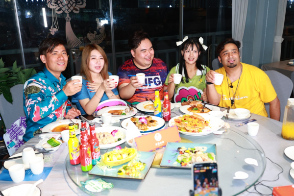 当晚助播的还有一直播女郎 娜娜,以及号称琶醍郭富城的歌手奕凯~~最先打开话匣子的,居然是三少和奕凯,两人不断发车搞怪,令Dj猪红和主播Sasa心如鹿撞~~幸好来到这家粤菜餐厅,阵容丰盛的美食碟头,瞬间抓住了所有人的注意力:波士顿龙虾、杏鲍菇炆鲍鱼、还有餐厅老板国哥家乡的海南文昌鸡和烤东山羊腿……情到浓时,国哥还加入直播阵营,和一众主播唱起了饮歌!奕凯终于可以大展拳脚,为自己助攻了一趟,获得了娜娜的青睐~~