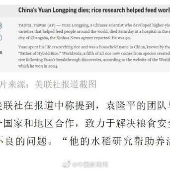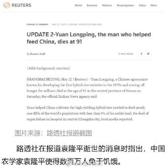路透社在报道袁隆平逝世的消息时指出,中国农学家袁隆平使得数百万人免于饥饿。