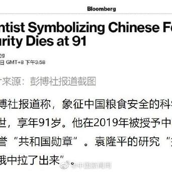 彭博社报道称,象征中国粮食安全的科学家袁隆平逝世,享年91岁。他在2019年被授予中国国家最高荣誉“共和国勋章”。袁隆平的研究“把无数人从饥饿中拉了出来”。