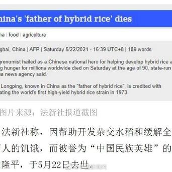 法新社称,因帮助开发杂交水稻和缓解全球数百万人的饥饿,而被誉为“中国民族英雄”的农学家袁隆平,于5月22日去世。