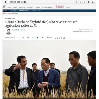 《印度报》在报道中提到,袁隆平“新的杂交水稻技术不仅造福于中国,而且也被其他国家积极采用。”