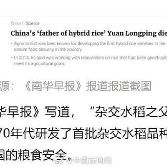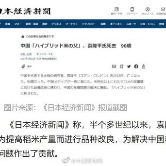 《日本经济新闻》称,半个多世纪以来,袁隆平为提高稻米产量而进行品种改良,为解决中国粮食问题作出了贡献。
