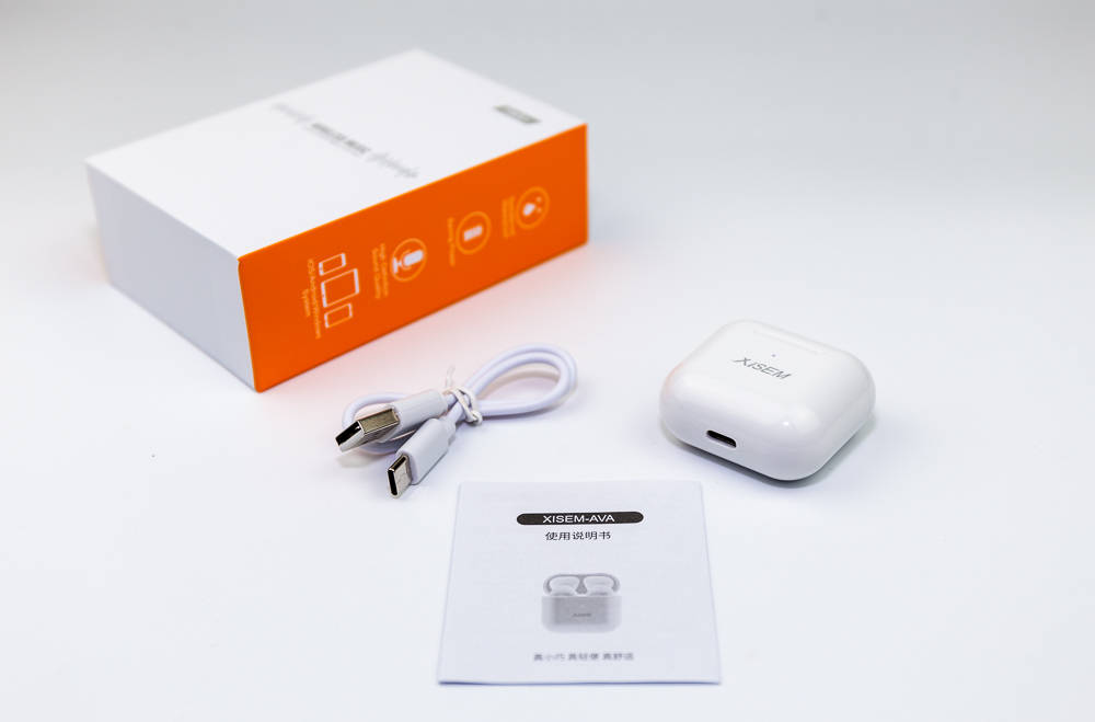 西圣 XISEM迷你真无线蓝牙耳机Ava的配件主要有一个充电盒(内置耳机),一个Type C接口的USB充电线,以及一本产品说明书。