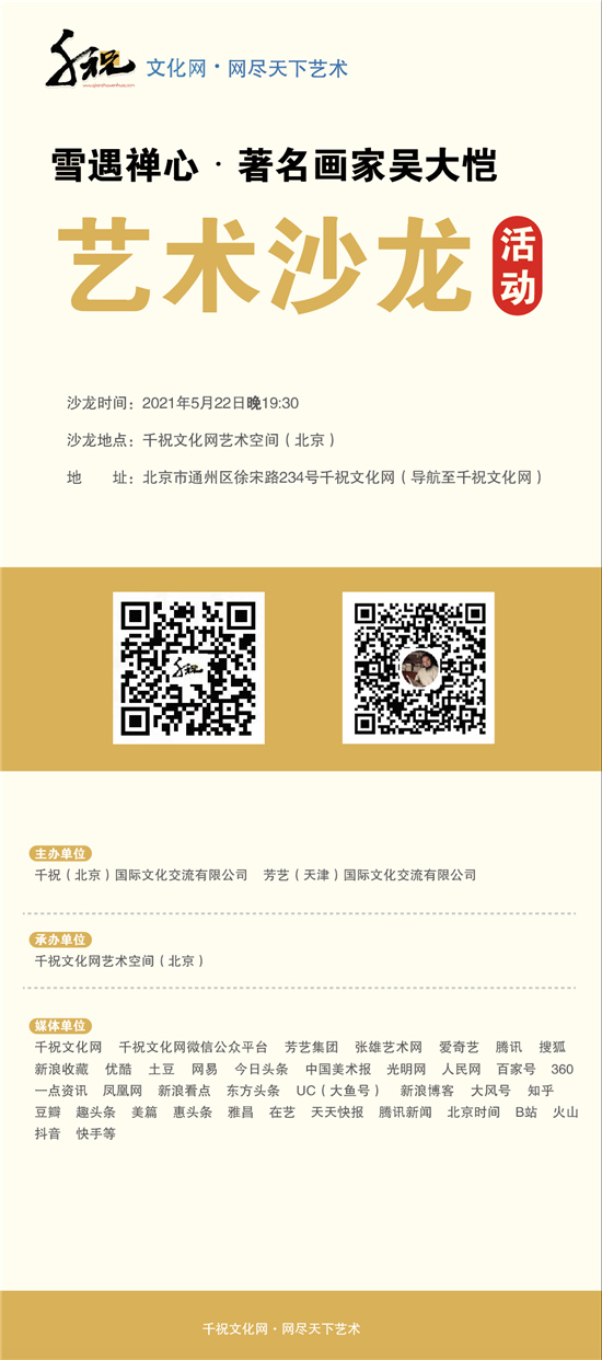 千祝文化网讯,5月22日晚 7:30分,由千祝(北京)国际文化交流有限公司,芳艺(天津)国际文化交流有限公司主办,千祝文化网(北京)承办的雪遇禅心-吴大恺国画作品主题沙龙活动,在千祝文化网艺术空间完美落幕。