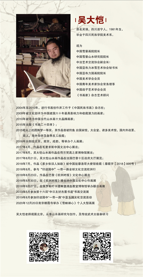 本次活动展出吴大恺先生近期创作精品力作30余幅作品,以吴老师独有的雪景禅意画为主。吴大恺笔下的“雪景艺术”世界人至敬、景至静、心至净、意至境。白雪皑皑,银装素裹,雪乡景色晶莹剔透。远景、中景、近景、特写、精心制作,匠心独运,充满北国风光大自然的神秘色彩。高山有神,形具而神生,高山有魂,附气之神谓之魂,使观者会产生一种身临其境之感、回归于大自然。人与冰雪环境很好的结合,体现出北国雪乡的风土人情,“点景人物”如花如玉,增加画面的美感和活力,美不胜收。