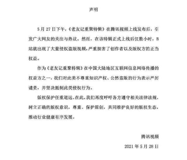 5月28日,《老友记重聚特辑》在刚上线几小时后就出现了盗版侵权视频,三家视频网站同时发布声明,呼吁保护版权。6月1日,新版《著作权法》正式施行,加大了侵权的打击力度。中宣部副部长张建春在2021中国网络版权保护与发展大会表示,要进一步发挥好网络版权执法的震慑作用,针对群众反映强烈的网络新闻、短视频、直播等领域的侵权盗版乱象,加大专项整治力度,推动互联网企业切实履行主体责任,进一步增强网络版权保护的主动性。