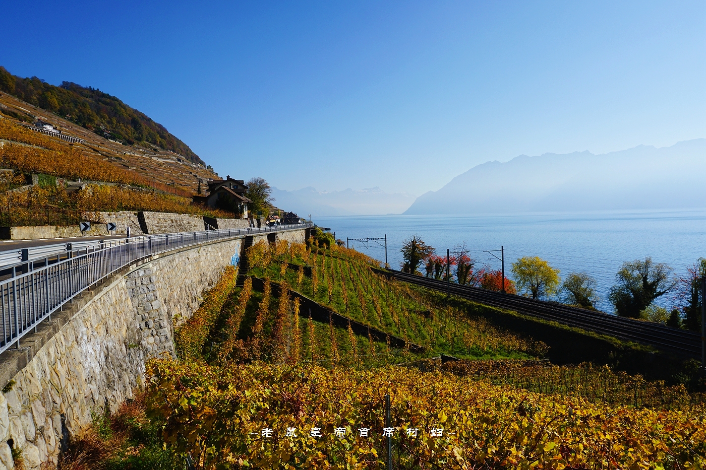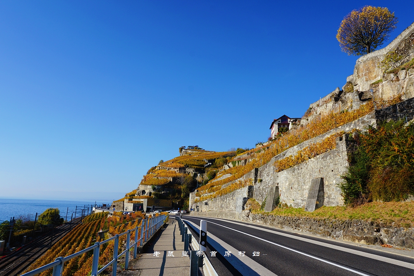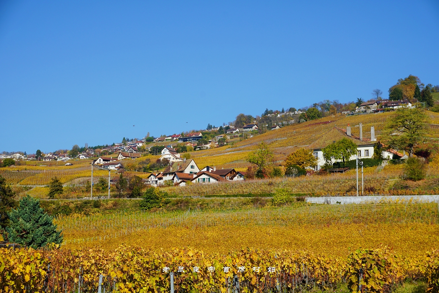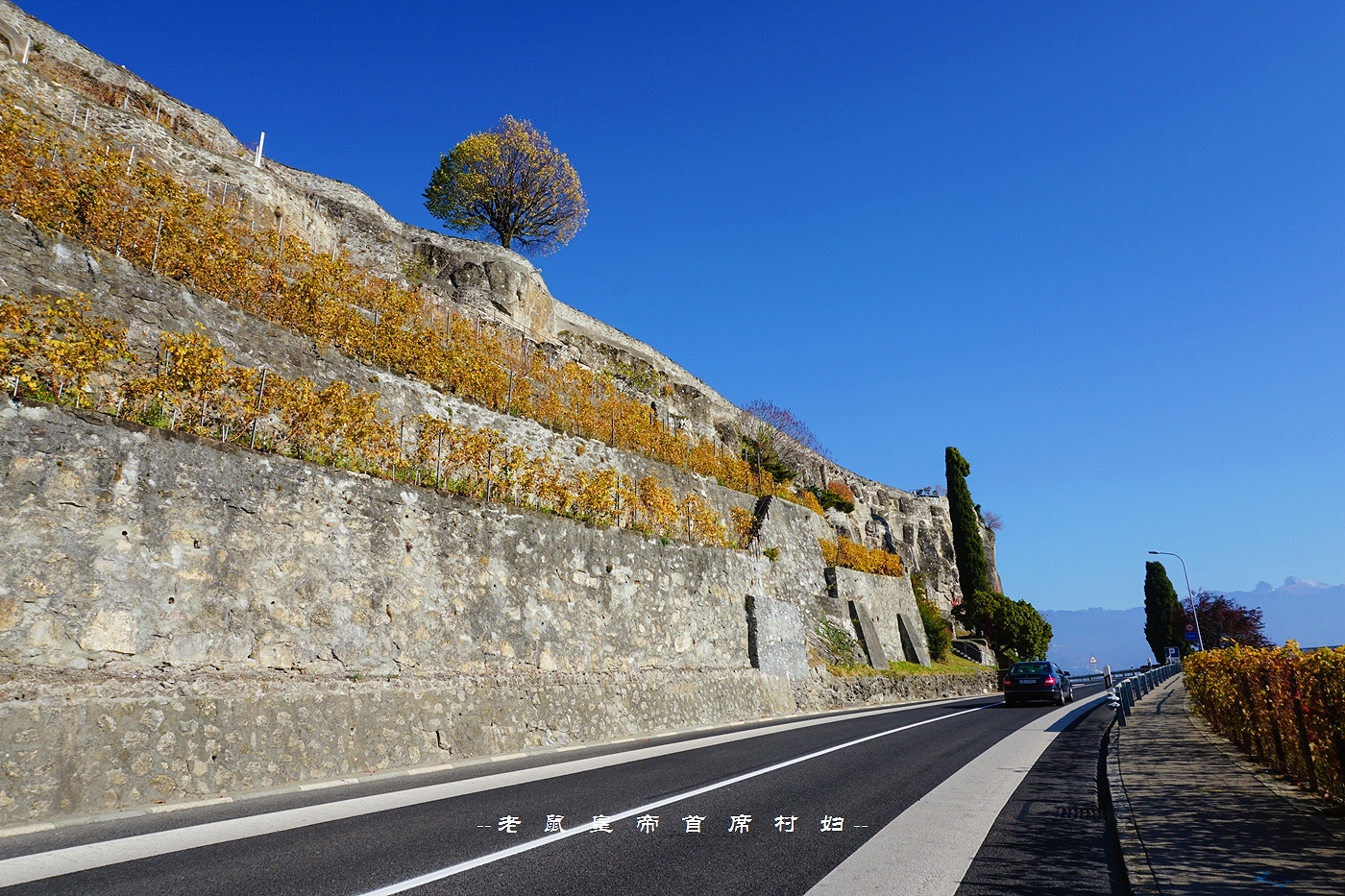 从日内瓦出发,向北自驾,是从中间穿过拉沃葡萄园的,右侧最外边是新月形的日内瓦湖,葡萄园顺着山坡的走势一路向下流淌,一直蔓延进瓦蓝瓦蓝的湖水里。