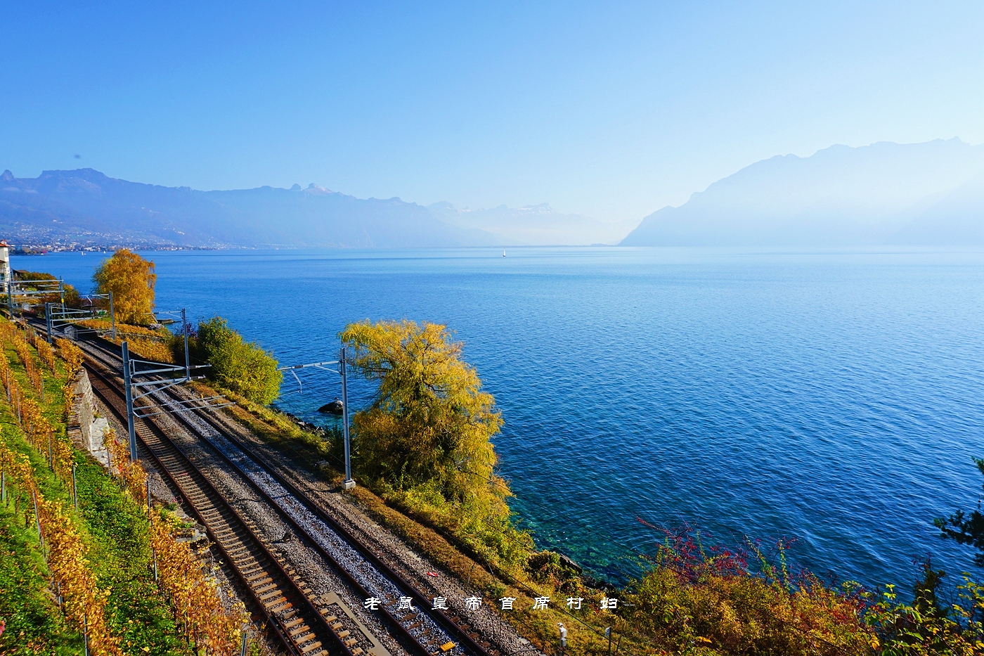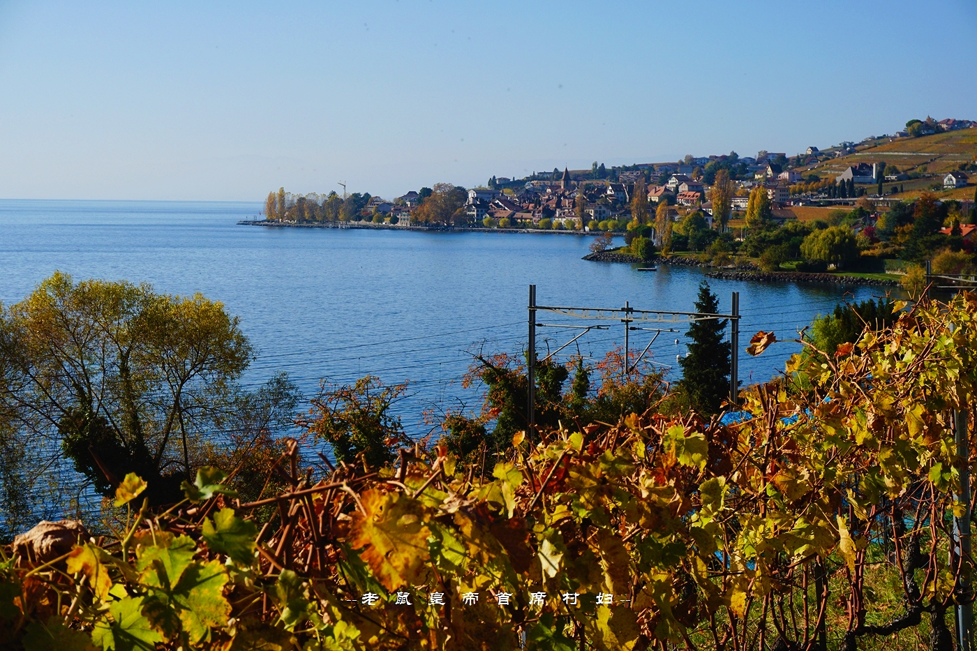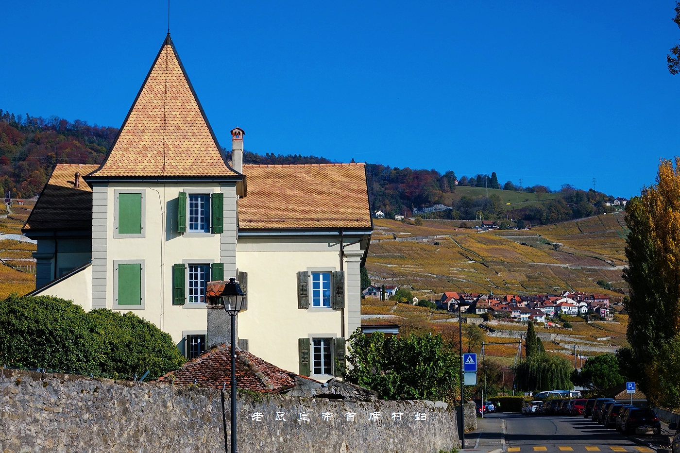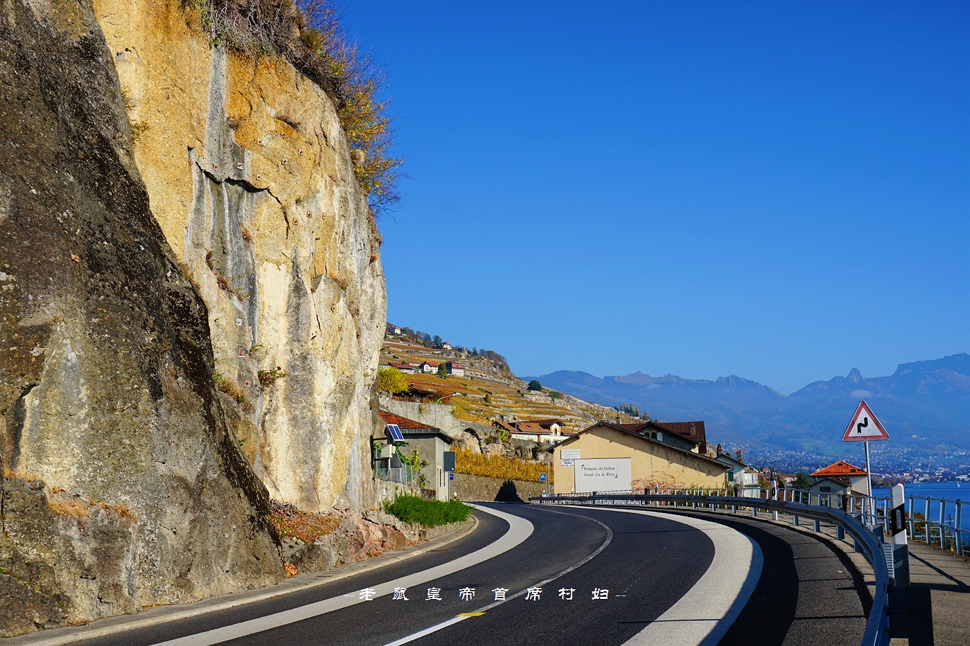 从日内瓦出发,向北自驾,是从中间穿过拉沃葡萄园的,右侧最外边是新月形的日内瓦湖,葡萄园顺着山坡的走势一路向下流淌,一直蔓延进瓦蓝瓦蓝的湖水里。