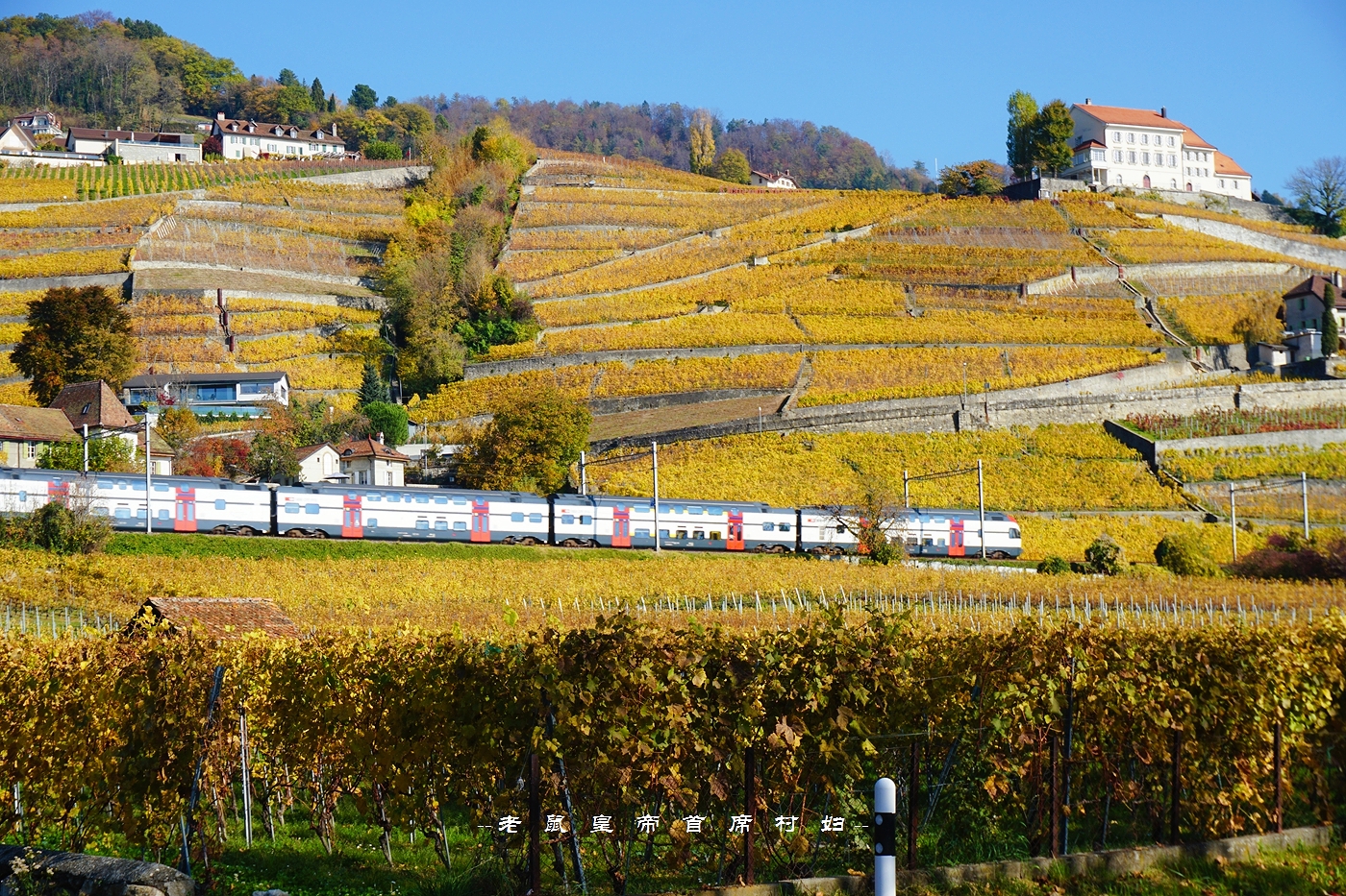 火车轨道也是从梯田中央通过,这一段是瑞士最美的火车观光线路之一。坐着火车喝着美酒看美景,想想就挺美好的。