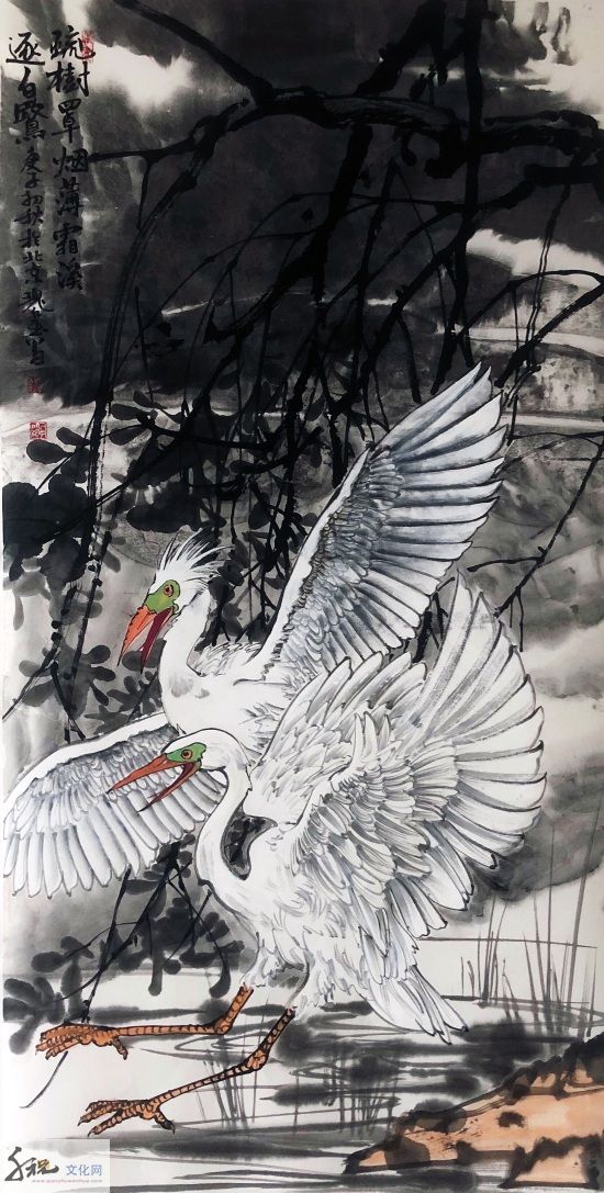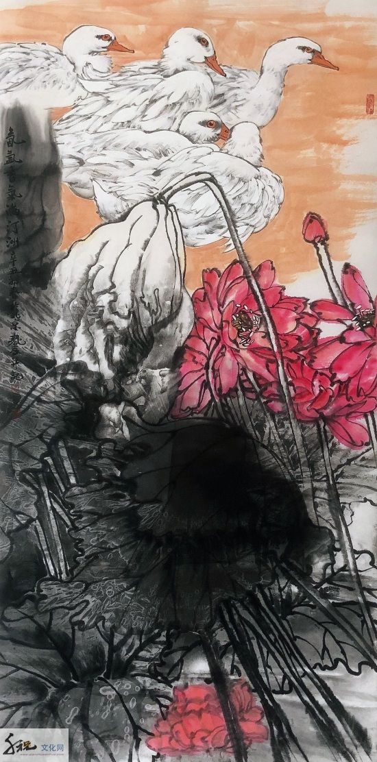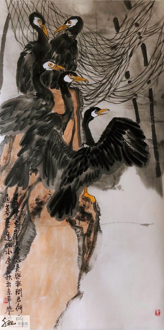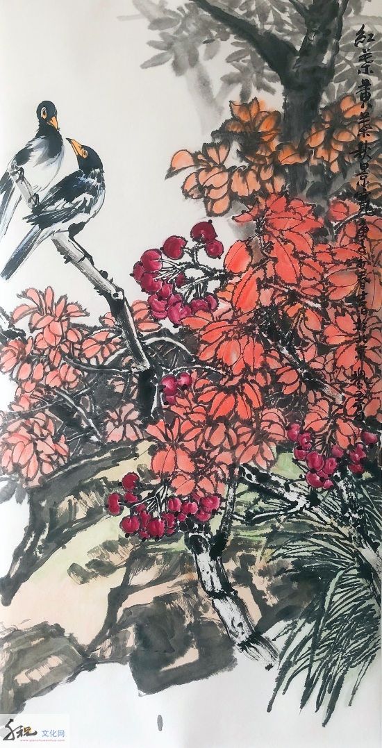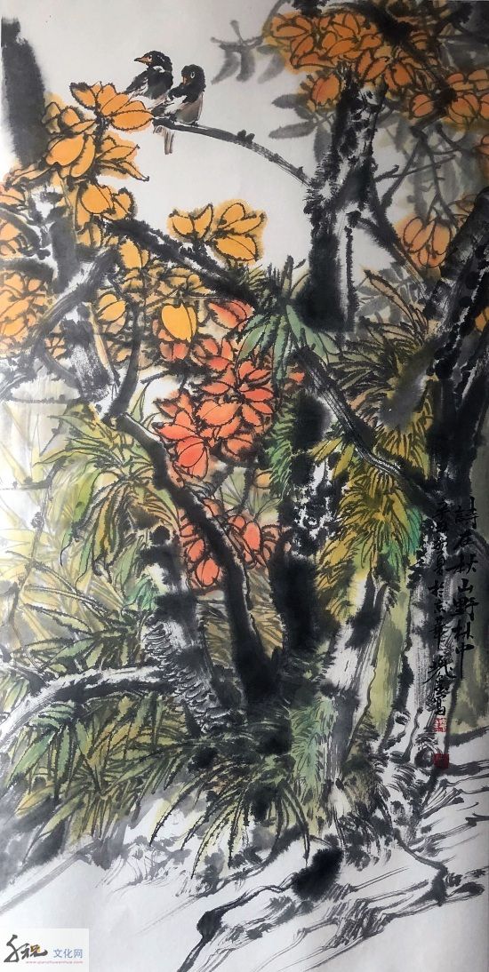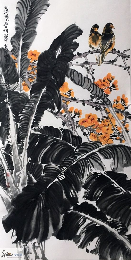 将工、写两家合流而成就他独有的半工半写风格,无论是重彩还是写意,都是他得之于自然而具学养、笔墨、气韵之大境,表现为当代人向人类原始本真状态回归的强烈意向,这是对生命的渴望,对自然的向往。当他挥毫落墨之时,胸中时时涌现出一种“大花鸟”意识,致使他的写意花鸟没有沿袭传统的惯性,走向类型化和象征化的旧途;而是以现代人的眼光和心灵,在感受生活和自然中直接描绘那些动植物及其生活和生长的环境,创造性地在他的画中,让硕大的鸟禽与山乡花木之丽、大野雄风之奇融为一体,来表露他对大自然客观世界的体验和认知。