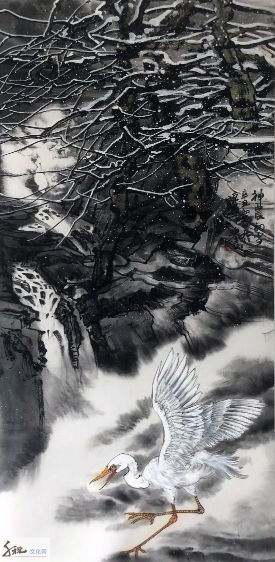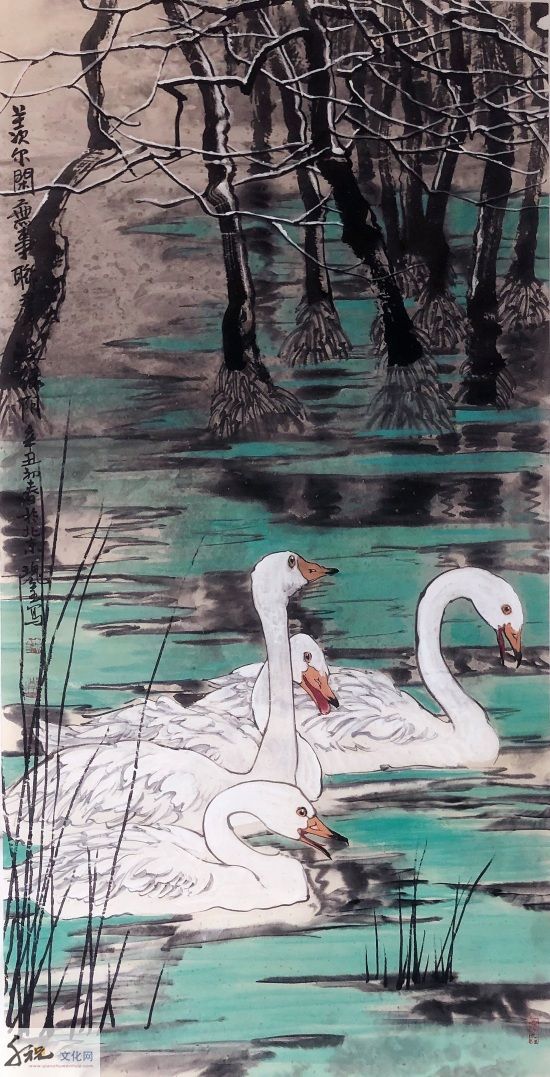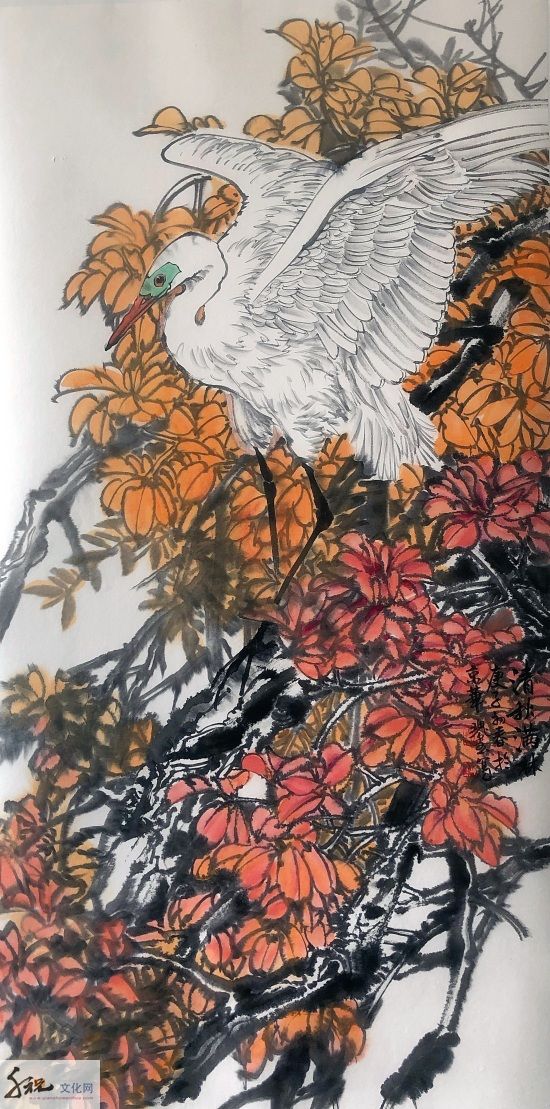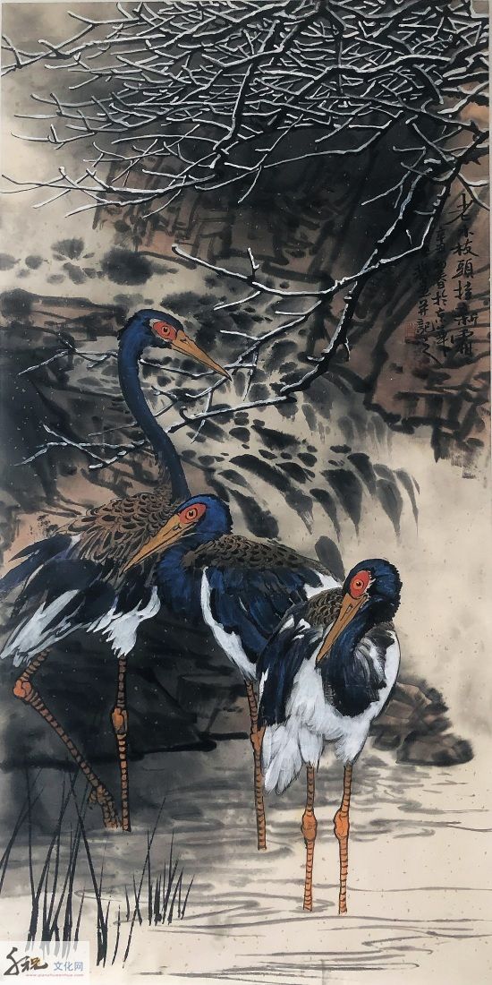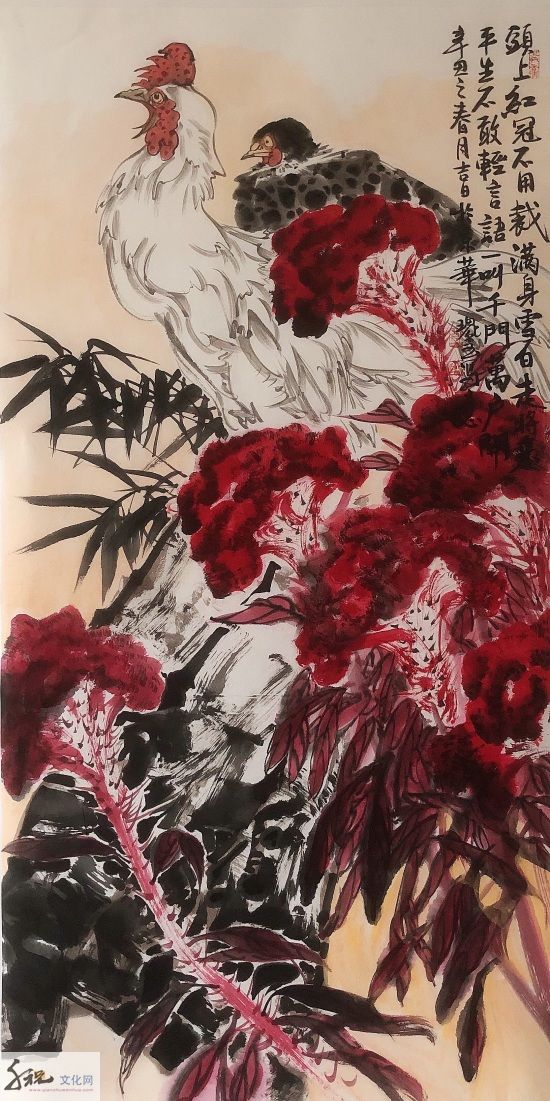 将工、写两家合流而成就他独有的半工半写风格,无论是重彩还是写意,都是他得之于自然而具学养、笔墨、气韵之大境,表现为当代人向人类原始本真状态回归的强烈意向,这是对生命的渴望,对自然的向往。当他挥毫落墨之时,胸中时时涌现出一种“大花鸟”意识,致使他的写意花鸟没有沿袭传统的惯性,走向类型化和象征化的旧途;而是以现代人的眼光和心灵,在感受生活和自然中直接描绘那些动植物及其生活和生长的环境,创造性地在他的画中,让硕大的鸟禽与山乡花木之丽、大野雄风之奇融为一体,来表露他对大自然客观世界的体验和认知。