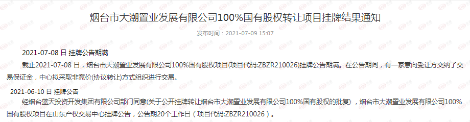 根据挂牌结果通知,截止2021年7月8 日,烟台市大潮置业发展有限公司100%国有股权项目(项目代码:ZBZR210026)挂牌公告期满。在公告期间,有一家意向受让方交纳了交易保证金,中心拟采取非竞价(协议转让)方式组织进行交易。