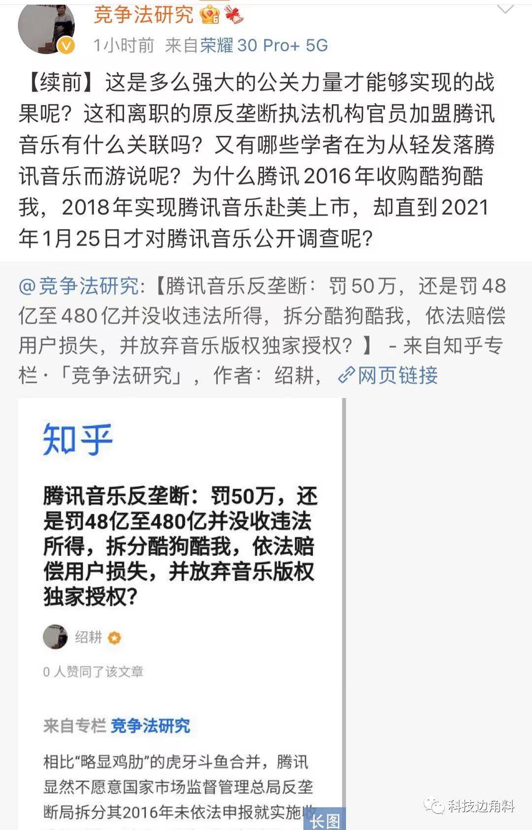 清华大学国家战略研究院特约研究员刘旭发文,直指处罚过轻,四问腾讯音乐:这是多么强大的公关力量才能够实现的战果呢?这和离职的原反垄断执法机构官员加盟腾讯音乐有什么关联吗?又有哪些学者在为从轻发落腾讯音乐而游说呢?为什么腾讯2016年收购酷狗酷我,2018年实现腾讯音乐赴美上市,却直到2021年1月25日才对腾讯音乐公开调查呢?