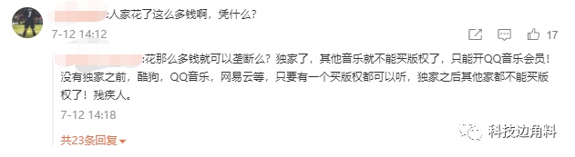 中国需要正版化,但搞独家版权不是答案啊!更有网友直戳要害:腾讯音乐花那么多钱,就可以搞垄断么?