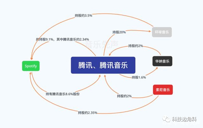 第二步,通过资本运作,把全球三大唱片公司也变成自家人。腾讯、腾讯音乐和环球、华纳、索尼全球三大唱片公司有错综复杂的交叉持股关系。