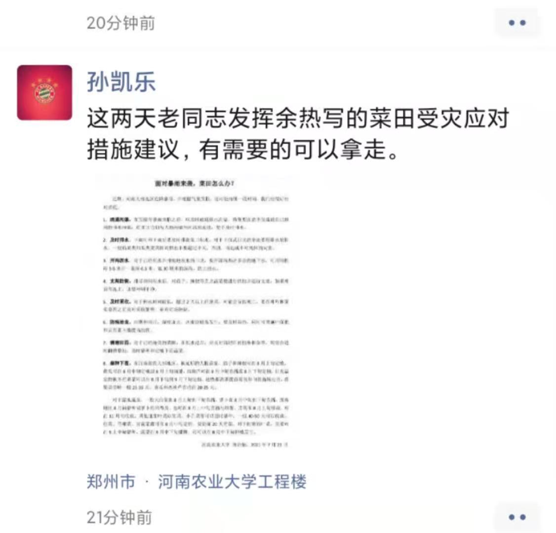 今天,面对千年一遇的特大暴雨,“农大天团”再次迅速成团,来自粮食作物生产、畜牧兽医、瓜果蔬菜等领域的54名专家将陆续赶往灾区一线,指导农户农企开展灾后生产恢复,尽力减少农业损失。