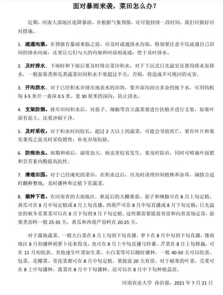 目前,第一批农大专家已第一时间奔赴西平、兰考、中牟、渑池等地开展农业防灾减灾服务,并利用各大主流媒体及新媒体平台,针对秋粮作物、中药材、果蔬、菌菇、林木、禽畜、水产等领域发布防灾减灾科技指导方案15套和生产指导建议80余条。