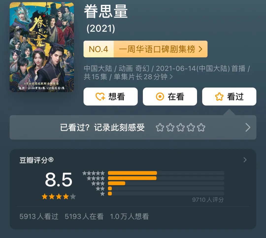 自开播以来,《眷思量》一直稳定在豆瓣华语口碑剧集榜TOP5,也是TOP5里唯一一部动画作品,评分8.5,比很多IP改编的动画还要高。同时,这部动画播出8集,播放量已经达到1.8亿。