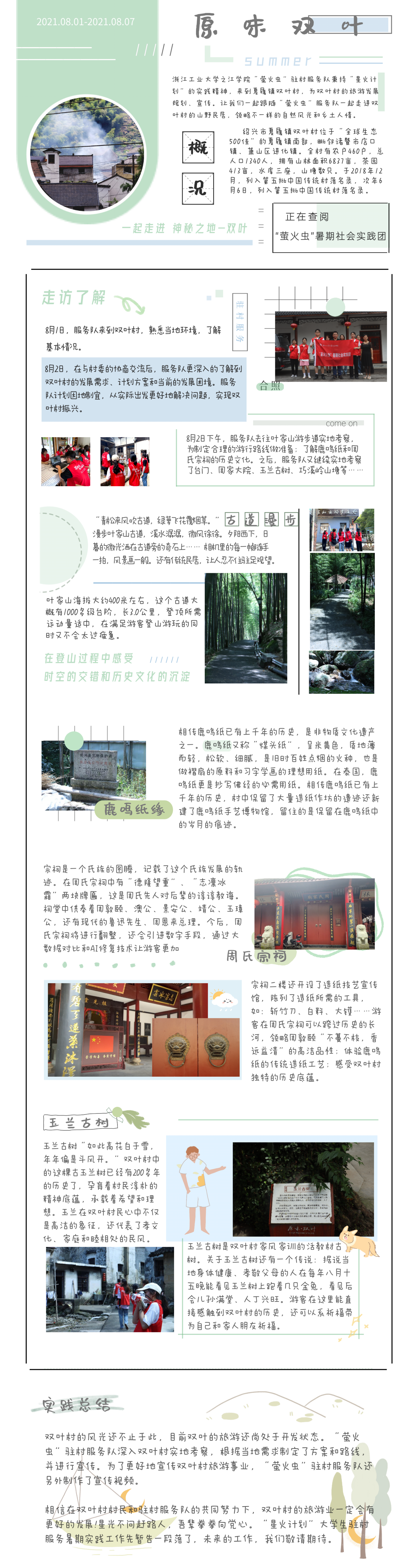 “溪水潺湲漱石轻,时惊山鸟别枝声。”2021年8月,浙江工业大学之江学院“萤火虫”驻村服务队秉持“星火计划”的实践精神来到双叶村,为双叶村的旅游发展规划、宣传。