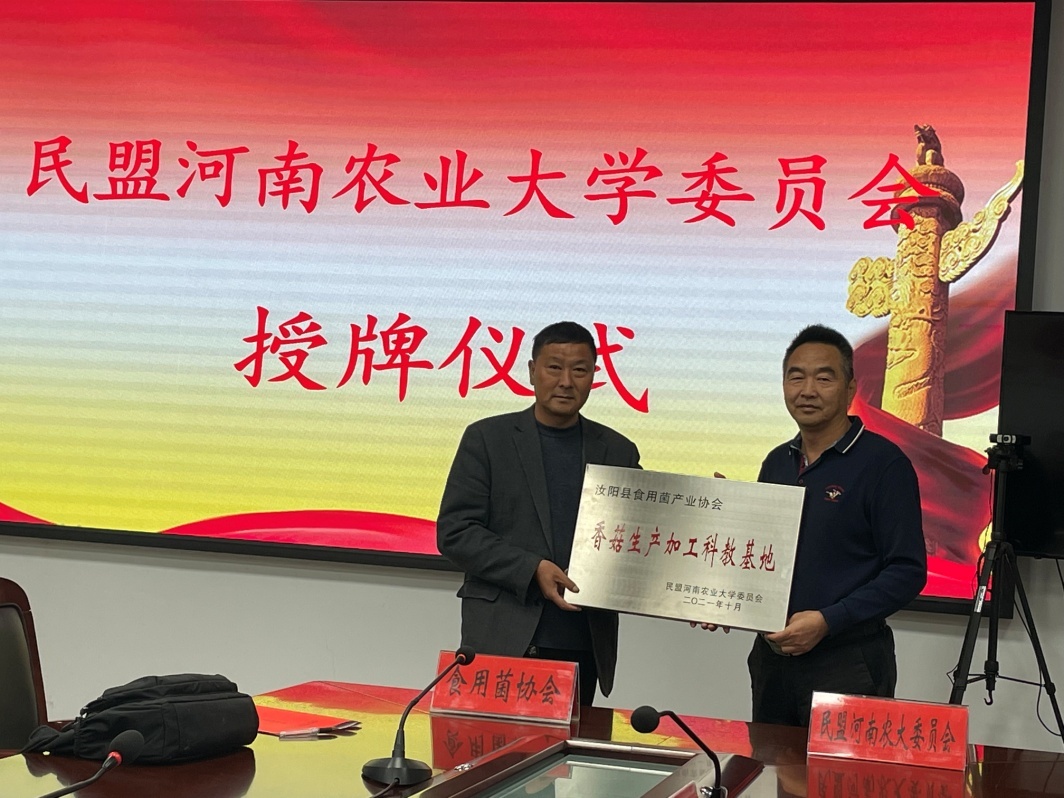 会议现场,民盟河南农大委员会为县食用菌协会授予香菇生产加工科教基地,为下一步开展富硒香菇技术试验、深加工产品开发建立研发平台。