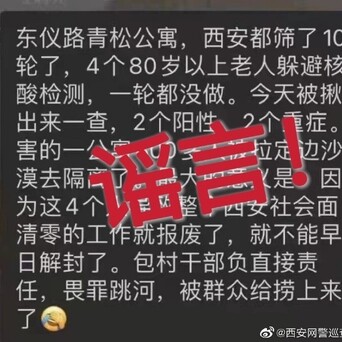 【西安800多人被拉定边沙漠去隔离?!假的!】今日,本地微信群中传播的一条信息,称“东仪路青松公寓,4个80岁以上老人躲避核酸检测,导致一公寓800多人被拉定边沙漠隔离,并称包村干部负畏罪跳河,被群众给捞上来了”。经核实,该信息为谣言信息。公安机关将依法追究恶意造谣、传谣者的法律责任。
