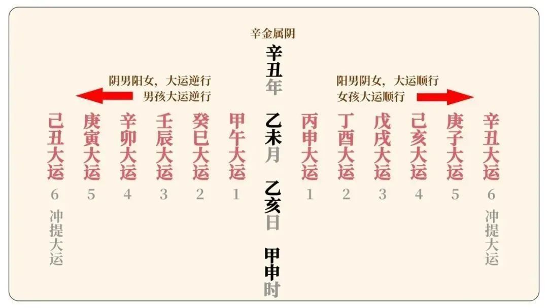 比如本月出生的人,都是辛丑年乙未月,所以大运就从“乙未”开始,然后依照六十甲子的顺序顺逆来推算。(因此八字月柱,又称为“大运提纲”)