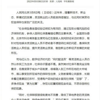 #建议北上广深社保可以带回家#[围观]灵活就业社会保障是两会热点议题。目前,灵活就业参保医疗和养老保险遵循自愿自主原则。影响现金收入、户籍限制、缴费年限长,是群体参保意愿低的主要原因。以城镇职工养老保险为例,灵活就业群体需缴纳20%的费用,其中12%进入统筹账户,8%进入个人账户。在返乡时,仅能带走8%个人部分。不少在北上广深地区工作的就业者,因为无法满足户籍以及连续缴纳15年的标准,选择在家乡参保。对此,全国政协委员司马红建议:遵循“钱随人走”原则,将社保的社会统筹部分金额与缴纳地解绑,企业与个人缴纳费用,均纳入社保权益转移接续范围。激发灵活就业人员社保缴纳的积极性,确保其制度公平、多缴多得。