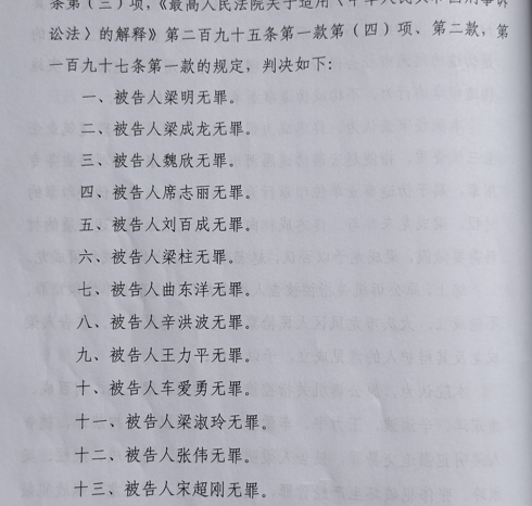 13名被告人的无罪判决梁明等13人涉恶犯罪团伙案件,是黑河市开展扫黑除恶专项斗争以来宣判的首起恶势力犯罪团伙案件。日前,梁明的亲属告诉澎湃新闻,该案经再审程序后,梁明等13人均被判无罪。目前,除梁明梁柱兄弟二人因疫情受困外地外尚未申请国家赔偿外,其余11人均已提出国家赔偿申请。