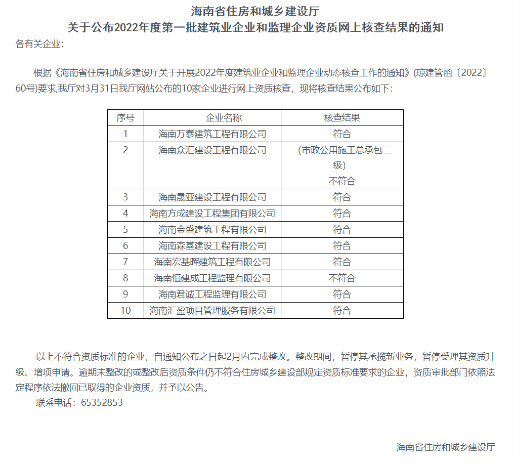2022年4月21日,海南省住房和城乡建设厅公布了核查结果,其中海南众汇建设工程有限公司(市政公用总承包二级)不符合,海南君诚工程监理有限公司不符合。不符合资质标准的企业,海南省住房和城乡建设厅通知公布之日起2月内完成整改。整改期间,暂停其承揽新业务,暂停受理其资质升级、增项申请。逾期未整改的或整改后资质条件仍不符合住房城乡建设部规定资质标准要求的企业,资质审批部门依照法定程序依法撤回已取得的企业资质,并予以公告。