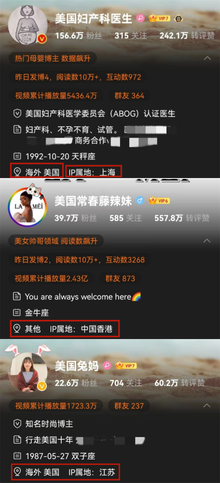 以美国为例,从@美国妇产科医生 到@美国常春藤辣妹、@美国兔妈,他们的IP属地分别在我国的上海市、香港特别行政区和江苏省。