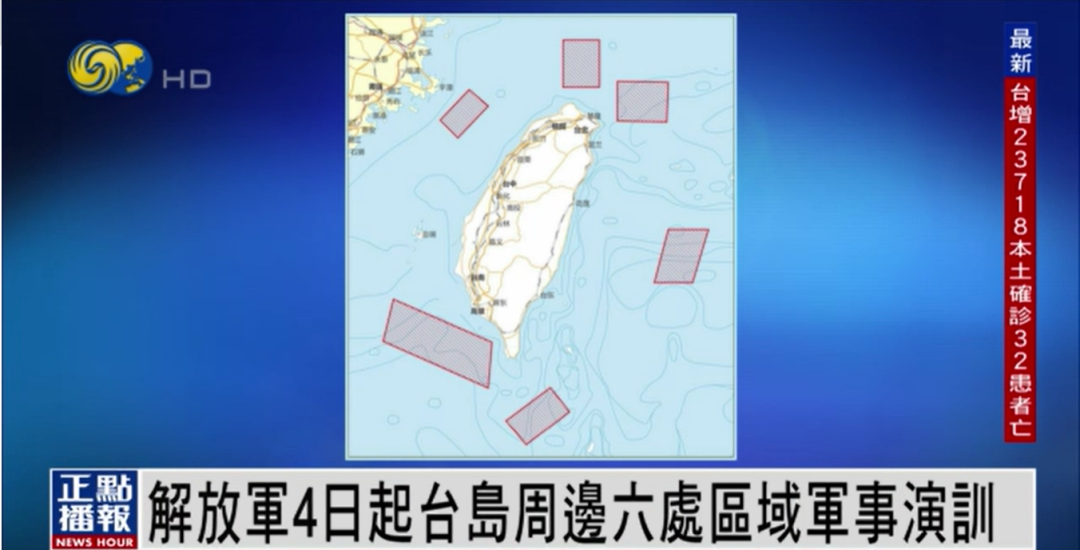 根据中央军委统一部署,解放军东部战区在当天发出公告,自8月2日起在台湾岛周边六片水域,展开海空联合实战演习。演习期间,所有船只、飞行器不得进入演习范围。
