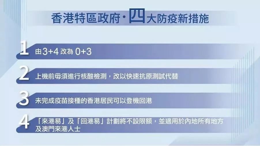 9月23日,香港特区政府宣布,在研究科学数据及平衡传播风险等因素后,决定从9月26日起撤销从海外或台湾来港人士的强制检疫要求,实施0+3即无需强制隔离只需3天医学观察的入境管理措施。