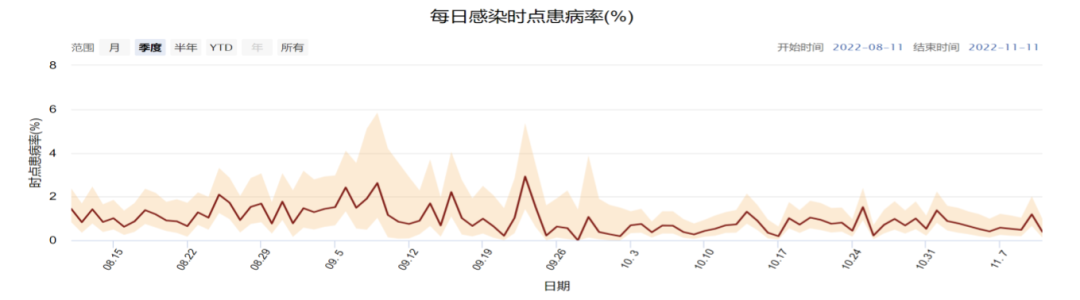 第二,香港实行0+3以来社区中受新冠病毒感染的总人数基本平稳(见下图)。香港大学公共卫生学院从香港18个行政区随机取10000人分成7组每天进行抗原检测,计算出阳性率。例如9月23日为2.92%(1.43-5.36%),10月23日为0.81%(0.4-1.5%),而11月11日为0.39%(0.13-0.98%)。也就是说,虽然输入个案增多,但社区中实际受感染的人数不增反降。