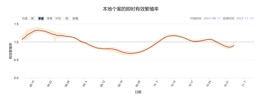 第三,香港实行0+3以来新冠病毒本地个案的有效繁殖率基本平稳(见下图)。有效繁殖率是指有一定的群体免疫力及实施一定的传播控制措施的特定时空下1位感染者可以将病毒传给多少人,反映的是病毒的实际传播率或传染性。如果此率在1以下,即代表疫情受控。9月23日此率为0.6811 (0.622-0.7383),10月23日为1.0632 (1.0262-1.0938),11月3日为0.9045 (0.8501-1.0003)。换言之,传染性非常强的新冠病毒奥密克戎毒株目前在香港的实际传染性并不强,也没有因为输入个案的增多而变化。