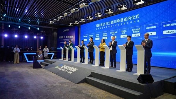 丽珠医药集团股份有限公司、海南葫芦娃药业集团股份有限公司、重庆康刻尔制药股份有限公司、万全医药控股集团有限公司、湖北福人亘泰医药贸易有限公司、江西欧氏医药股份有限公司、四川川力舒医疗器械有限公司代表及合纵药易购总裁陈顺军、高级副总裁陈越共同启动“领川项目”签约仪式