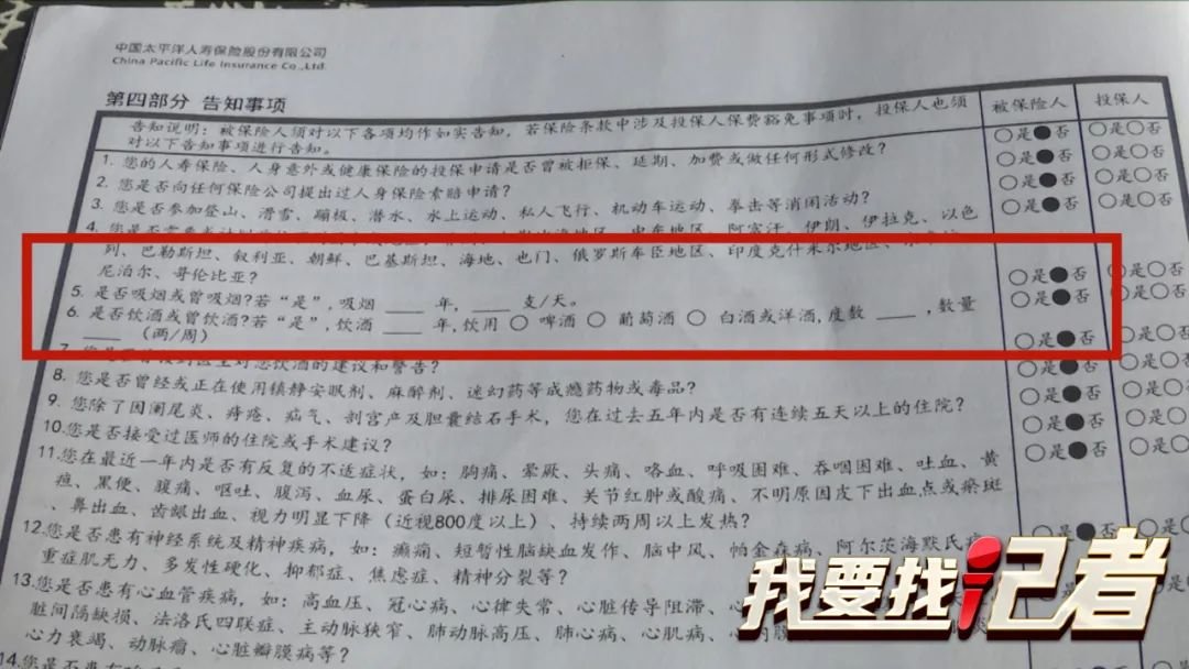 “保险公司一开始是不赔的,两份保险一份都不赔,我不同意,就只赔了第一份。拒赔原因就是说我没有如实告知老公抽烟喝酒。”陈女士告诉记者。