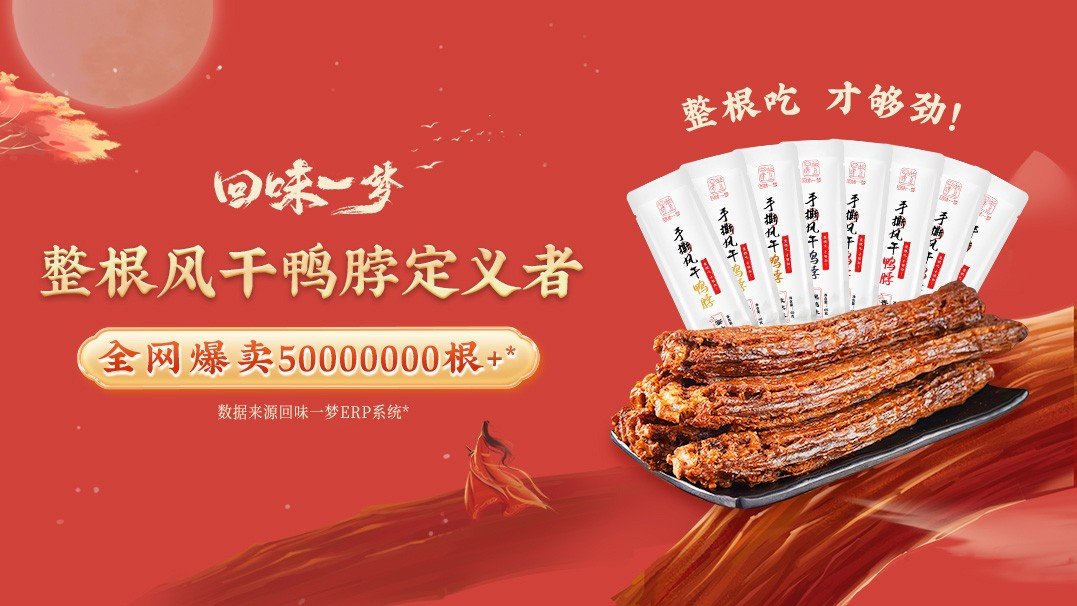 与此同时为保证让每一位消费者随时随地都能够吃到够鲜够味的好鸭脖,回味一梦还还采用了升级版的氮气常温锁鲜技术,有效隔绝空气。而恰好“整根吃,才够劲”的鸭脖与内容电商的特质十分匹配:超强的视觉冲击力、多样化的场景应用、差异化的产品特点,使得其成为各个直播间热门产品,以此提升品牌的互动与转化,建立消费者“心锚”:“风干鸭脖就吃回味一梦。”