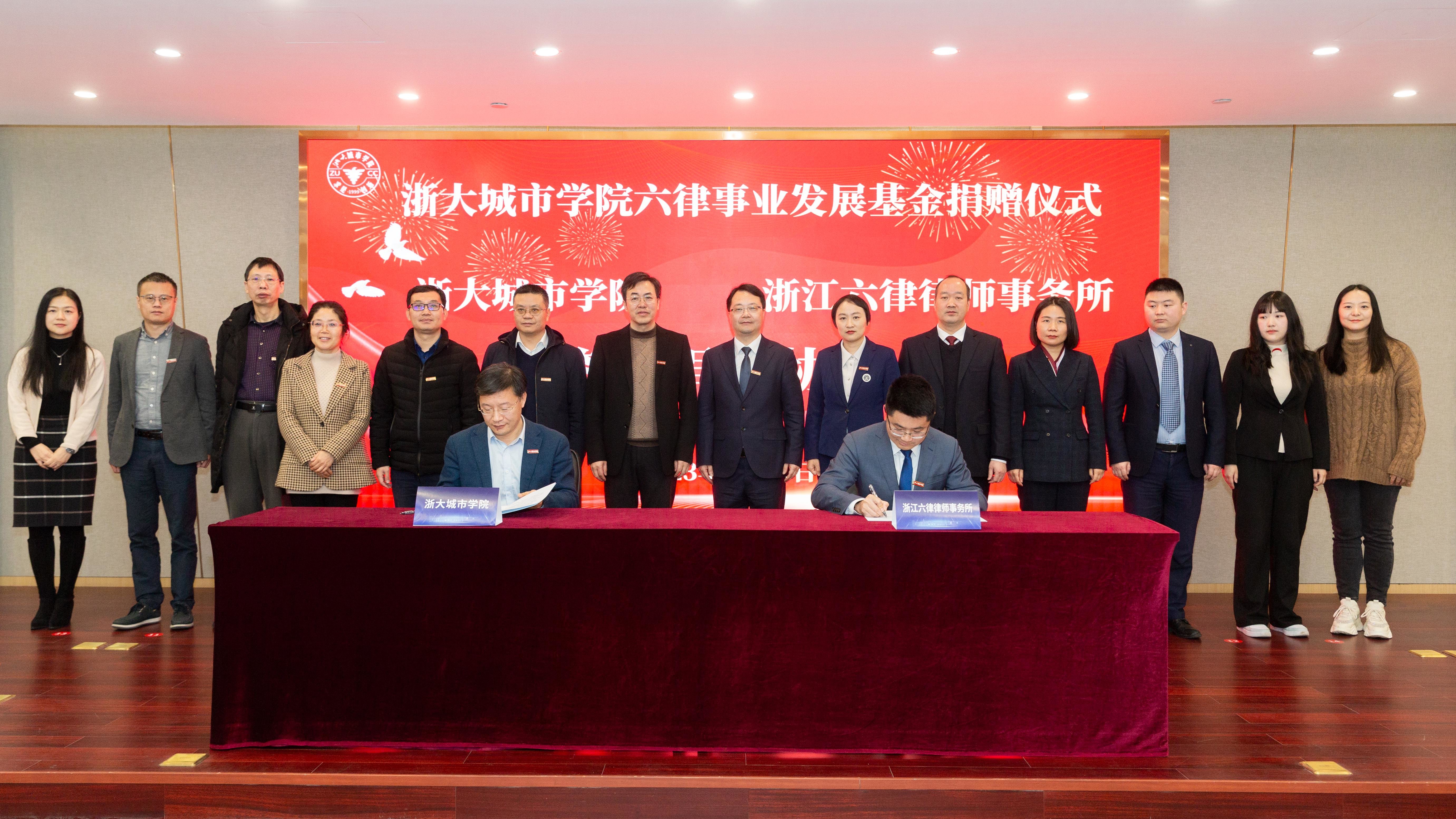 2月14日,浙江六律律师事务所向浙大城市学院捐资100万元,用于学校教育事业的发展。校党委书记洪庆华向浙江六律律师事务所主任周建平颁发捐赠证书,副校长斯荣喜和浙江六律律师事务所副主任胡斌分别代表双方签约。