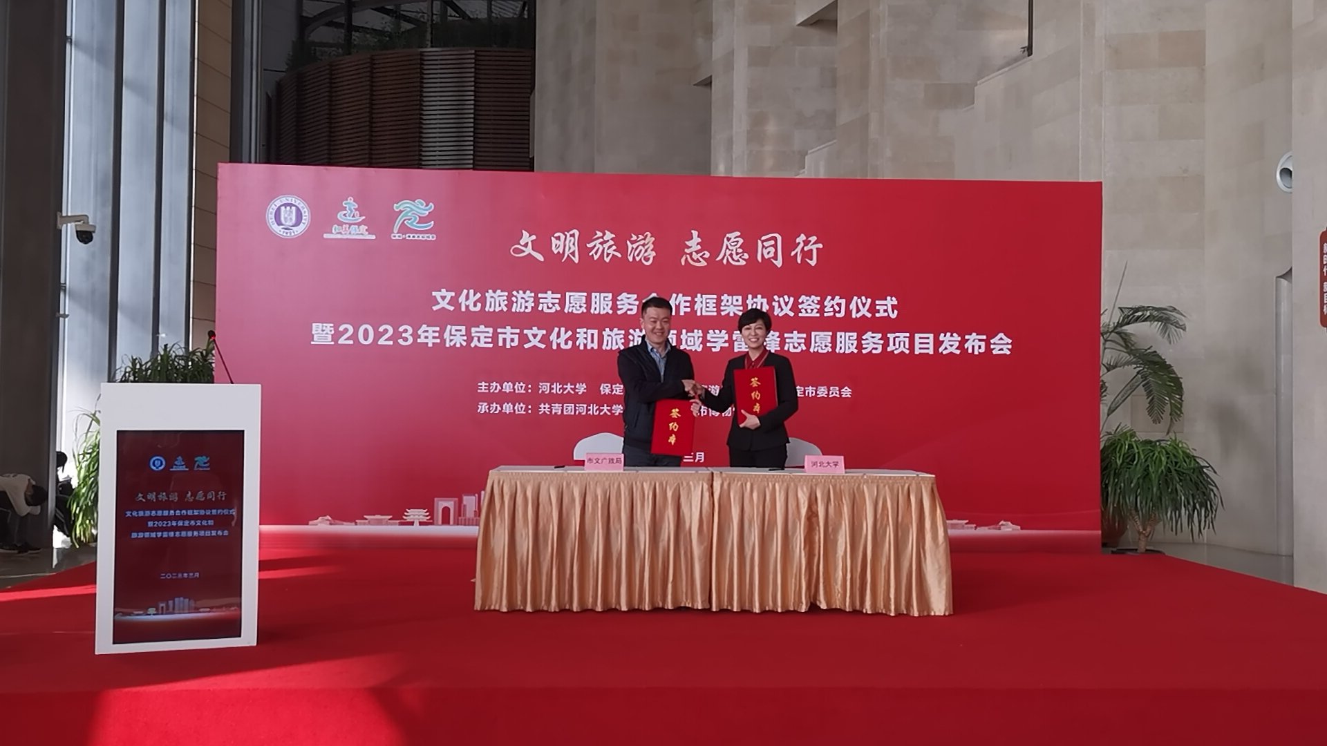 3月5日,保定市文化广电和旅游局与河北大学签订了《文化旅游志愿服务合作框架协议》。