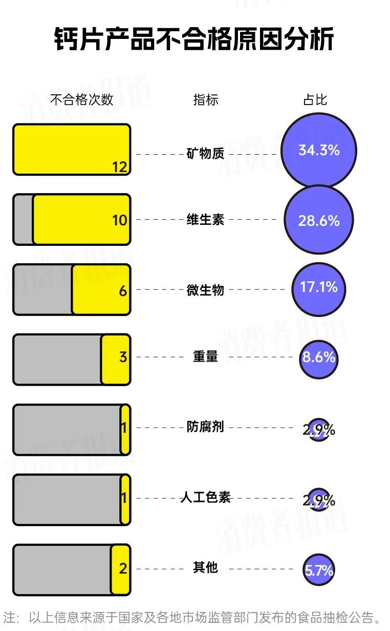 其中,矿物质和维生素不足是钙片产品不合格最突出的问题,共发现22次,占不合格比例超过5成,达到62.9%。