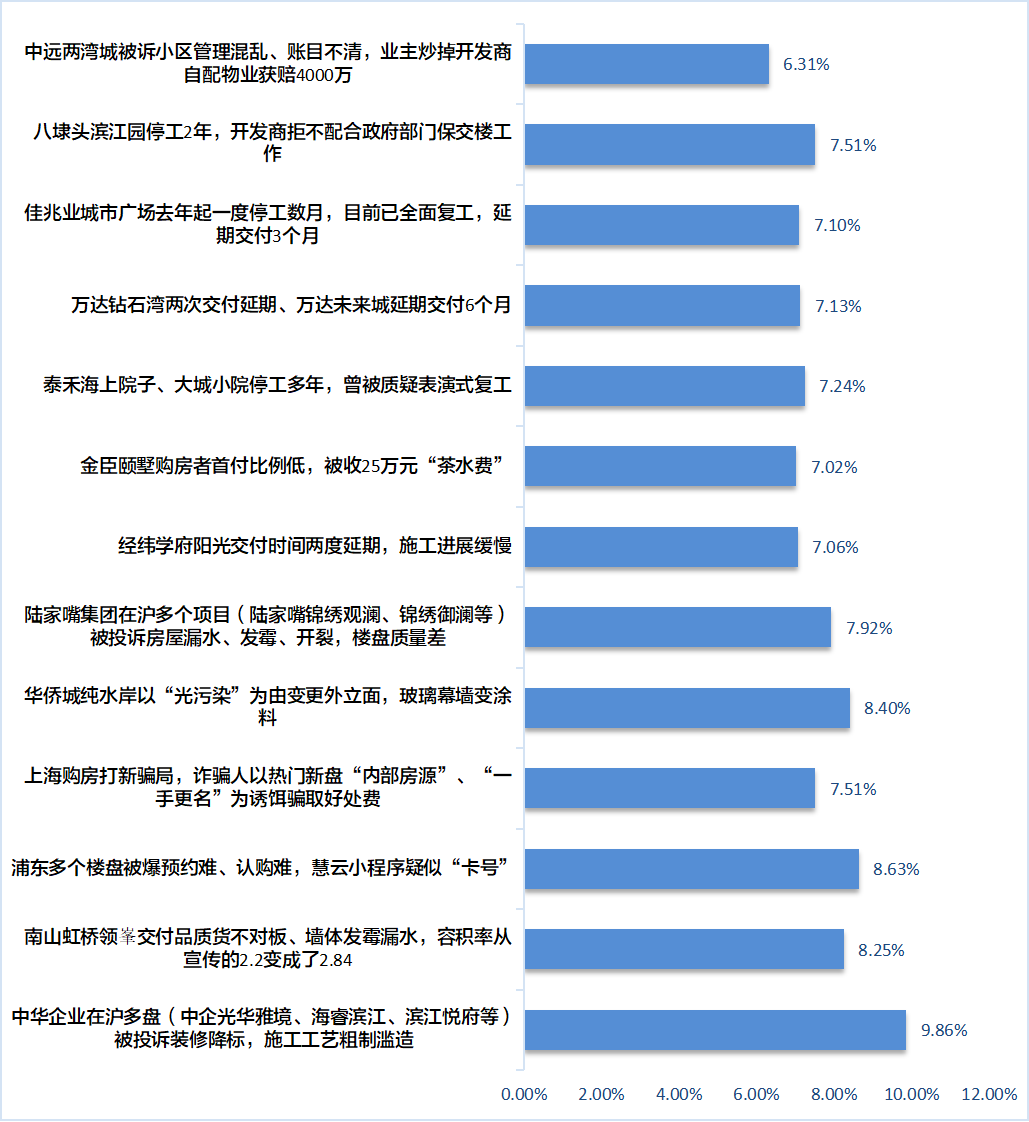 截至目前,投票已有超过2000人参与,停工、烂尾、装修降标、虚假宣传成上海楼市最常见投诉主题,中企、华侨城、陆家嘴集团位居被投诉最多的房企品牌前三。