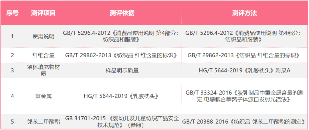 本次试验从消费者角度出发,结合了样品宣传信息,对样品的材质和安全性能进行测试和比较。测评项目为使用说明、纤维含量、罩杯填充物材质、重金属和邻苯二甲酸酯。测评依据及方法见下表: