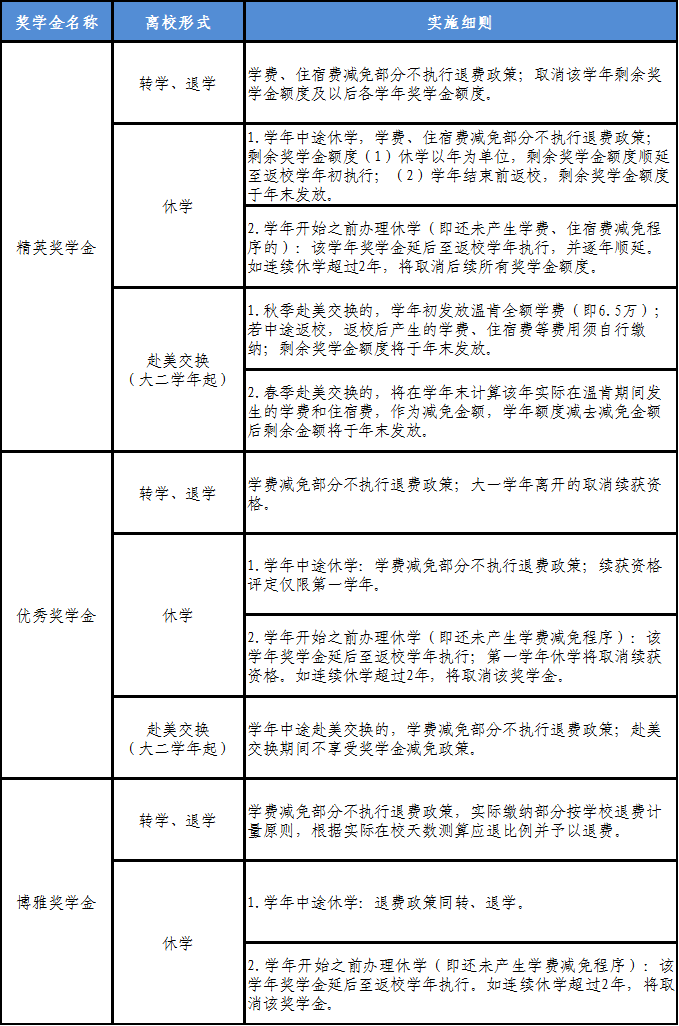 凡学生在学年中途转、退、休学的,学费和住宿费减免部分不执行退费政策;其中,转、退学的取消该学年剩余奖学金额度及以后各学年奖学金额度,休学的剩余奖学金额度视具体情况发放。凡学生在学年中途赴美交换的,每期金额根据实际在校情况发放(详见《2023年新生奖学金实施细则》);