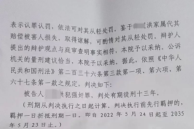 2022年7月15日,当地法院不公开开庭审理了此案。法院查明,黑车司机先后3次在车内强奸小梅,致其怀孕产子,情节恶劣,后果严重。黑车司机接到警方电话到案后,如实供述其犯罪事实,系自首,且当庭表示认罪认罚,依法可对其从轻处罚。鉴于司机家属代其赔偿被害人损失3万元,取得谅解,可酌情对其从轻处罚。最后,黑车司机以犯强奸罪被判处有期徒刑13年。
