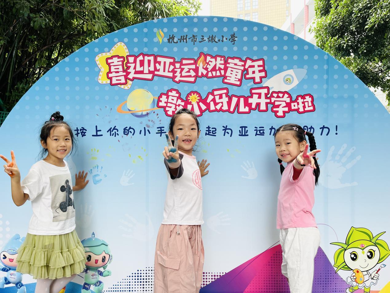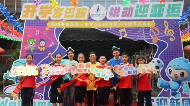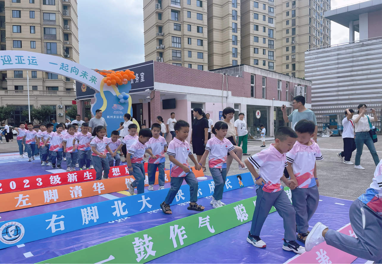 湖州市织里镇晟舍小学迎来了一年级新生,小朋友们走进校门,领取一年级新生纪念卡,跑步、拍球、摸高、认识亚运项目。他们以亚运主人翁的姿态迎接新学期,同时体验了“更高、更快、更强、更团结”的奥林匹克精神。