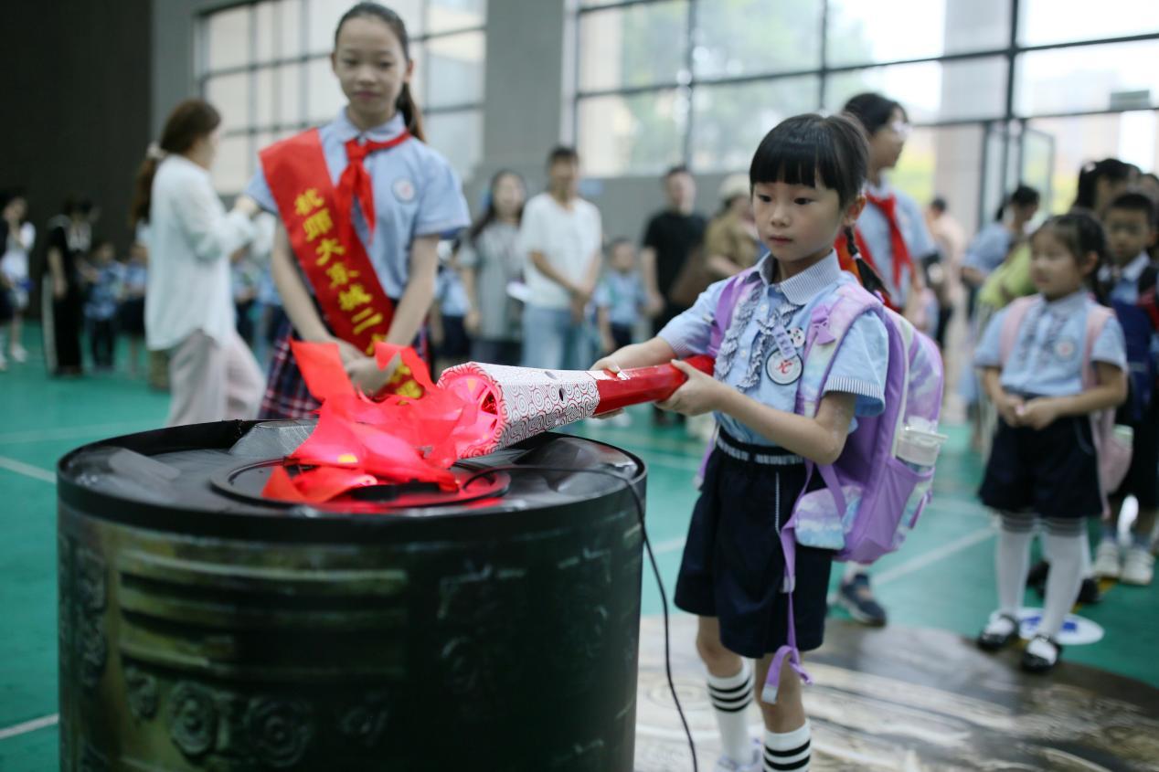 “本次迎新仪式融入亚运元素,精心设计良渚之源到钱潮之约系列活动,跨越千年,真正让孩子了解杭州办亚运具有深厚的底蕴支撑。”杭州师范大学东城第二小学校长郑君辉提到本次迎新仪式的初衷。同学们点燃“亚运火炬”,如同点燃梦想;同学们拿到亚运集章入学手册,百天养成好习惯,就可以获取专属的亚运印章。