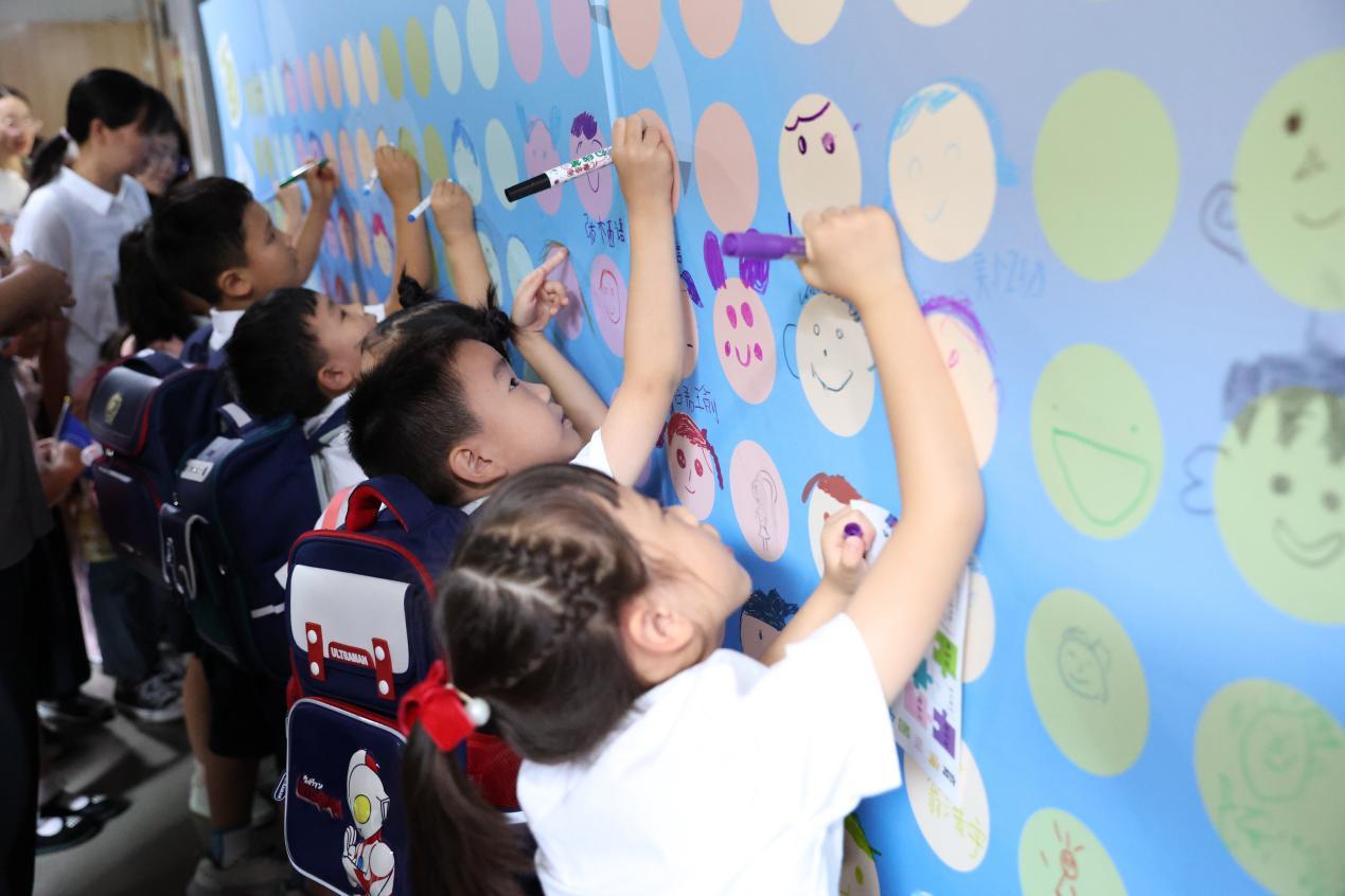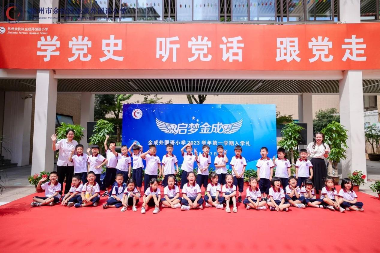 8月27日,杭州市余杭区金成外国语小学又迎来了一批“小萌新”。小朋友们踏进校门,在象征着六个班级的六块大树立牌前将写有自己名字的红苹果贴到大树上,一年级的老师们手持启智笔为新生开蒙启智,在他们的额间落下一点红,寄托美好祝愿。他们亲手绘画梦想信封,将“梦想”投递到梦想箱中,在“启梦·金成”打卡墙前,拍照留念。